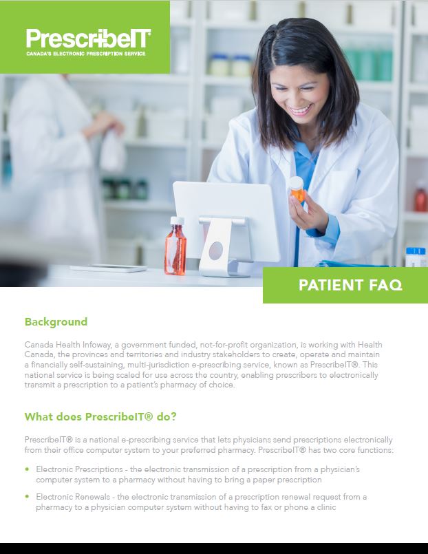 Download the PrescribeIT® Patient FAQ for more information on Canada's e-prescribing service.