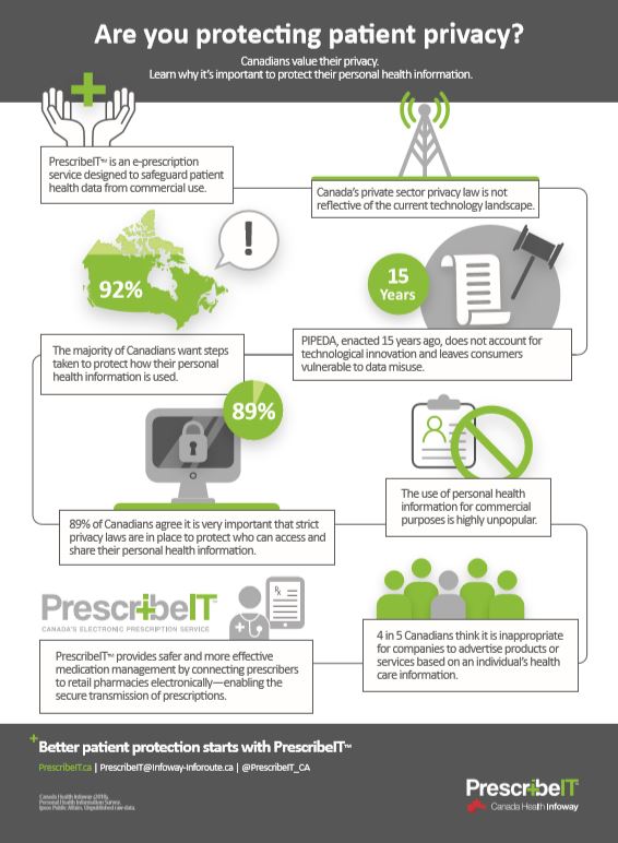Canadians value their privacy, but current privacy legislation is 15 years ago and does not account for technological innovation, leaving consumers vulnerable to data misuse. Learn why it’s important to protect their personal health information and why PrescribeIT™ was designed to safeguard patient health data from commercial use.